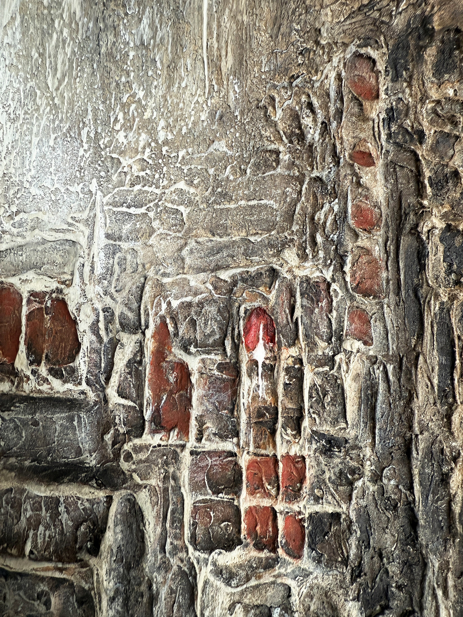 Le contraste entre les tonalités minérales et les touches de rouge crée une vibration subtile, comme une lumière intérieure qui traverse l’ensemble.