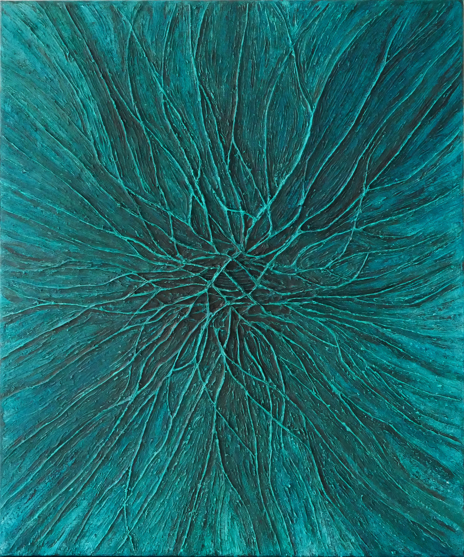 Acrylique sur toile - Format 50x60 - Un labyrinthe abstrait, un entrelacement de ligne de vie, une marque laissée dans la mémoire de chacun. Cette œuvre s'éclaire par son relief et laisse l'imagination se projeter par sa couleur précieuse