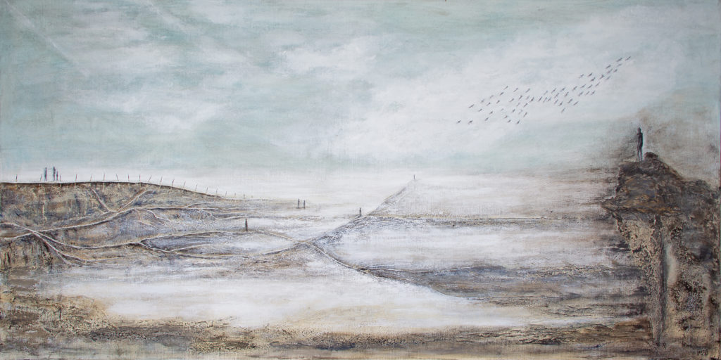 Le paysage, volontairement épuré, oscille entre matière et effacement, laissant apparaître des formes discrètes, presque suspendues.