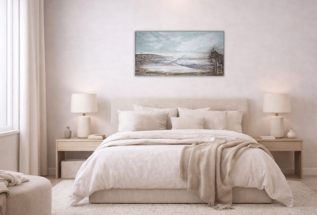 La texture, enrichie par le sable, ancre l’œuvre dans une présence terrestre, tandis que les teintes douces ouvrent vers une sensation d’infini.