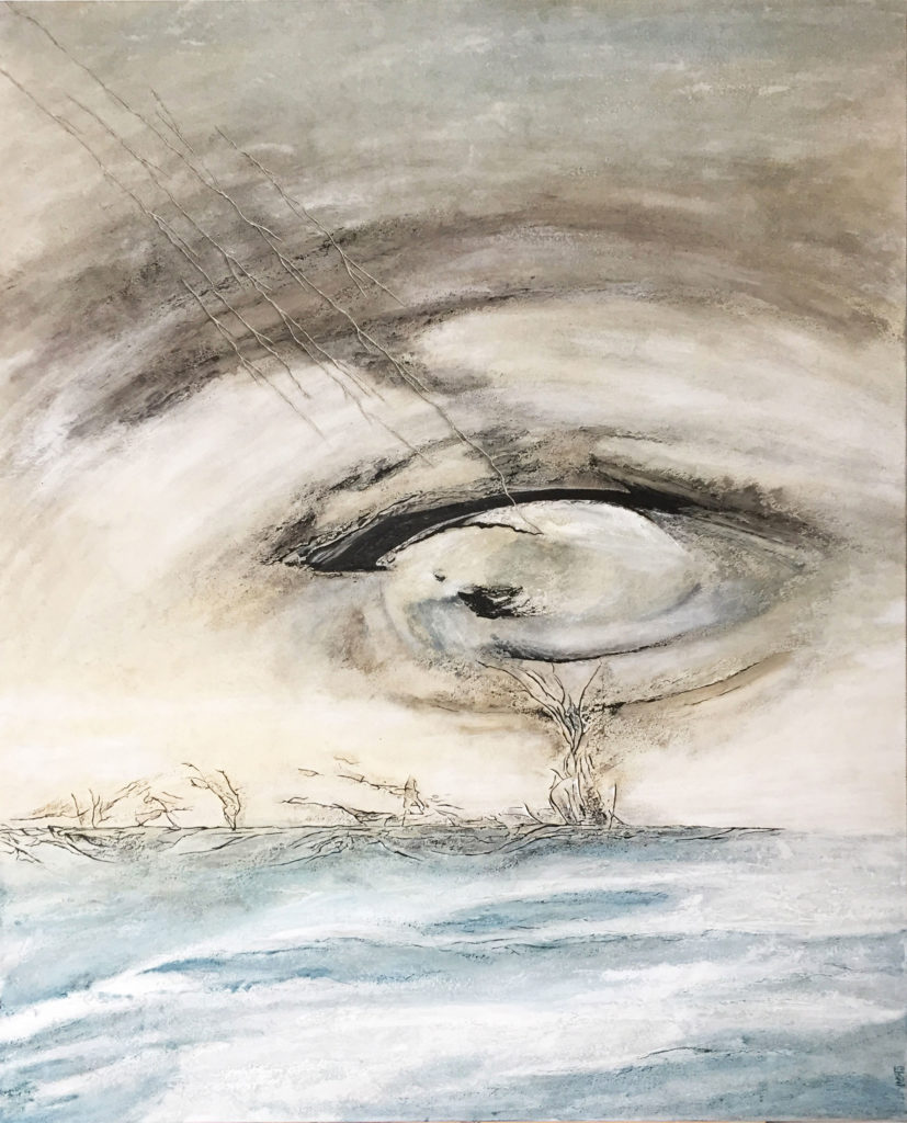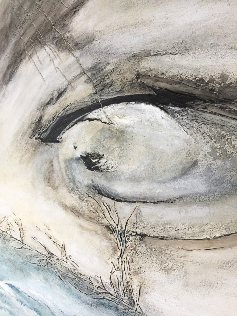 Dans la matière affleure un regard, presque silencieux, où semblent se déposer des larmes suspendues.