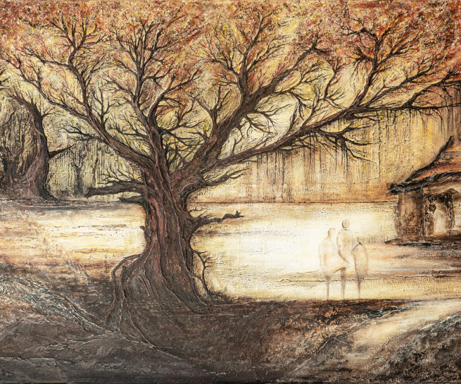 Acrylique sur toile - Format 110x70 - Un premier volet avec l’automne - Un voyage imaginaire à travers nos campagnes, les saisons et les éléments naturels de la vie. Un arbre majestueux se dresse au dessus d’un petit lac et 3 personnages translucides restent figés par la beauté de la nature - Ce tableau est réalisée avec la Modeling Paste Artist sur une toile tendue sur chassis recouverte de chamotte pour aider le relief à s’intégrer.