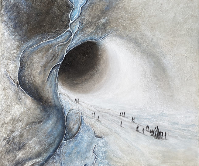 Acrylique sur toile - Format 80x80 - Cette œuvre captivante présente un paysage surréaliste dominé par une immense vague tourbillonnante, semblant engloutir tout sur son passage. À l'avant-plan, une plage désertique, peuplée de minuscules silhouettes humaines, accentue l'immensité et la puissance de la scène naturelle. La palette de couleurs, composée principalement de nuances froides de bleu et de gris, renforce l'atmosphère mystérieuse et onirique de l'œuvre. Les coups de pinceau fluides et le jeu d'ombre et de lumière créent une profondeur saisissante, invitant le spectateur à explorer les détails fascinants de la composition. Le contraste entre la fragilité humaine et la force intemporelle de la nature émerge avec force, évoquant des thèmes de vulnérabilité et de survie. Ce tableau interpelle et transporte, offrant une réflexion profonde sur la place de l'homme face aux forces de la nature.