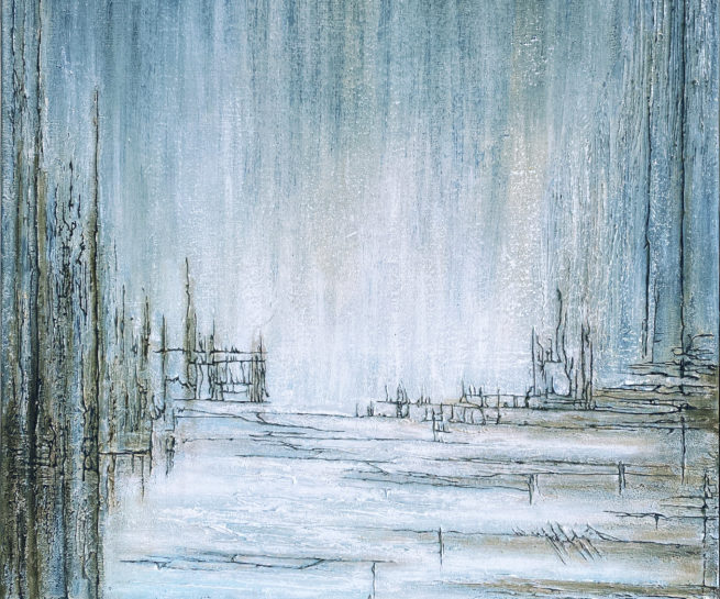 Acrylique sur toile - Format 60x80 - Cette œuvre d'art présente une scène éthérée, évoquant un paysage enveloppé de brume. Les nuances de bleu et de gris se fondent harmonieusement, créant une atmosphère à la fois mystérieuse et apaisante. L'utilisation de lignes verticales et horizontales suggère des structures architecturales, tandis que les textures subtiles ajoutent de la profondeur et du mouvement à la composition. L'effet de flou vertical accentue l'impression de pluie ou de brouillard, invitant le spectateur à se plonger dans l'immensité du paysage. La luminosité centrale attire l'œil vers un horizon lointain, engendrant une sensation d'espoir. Cette œuvre se distingue par sa capacité à évoquer des émotions à travers un mélange de technique et de minimalisme. C'est une exploration visuelle de la tranquillité et de l'infini, captivant l'imagination avec sa représentation ambiguë du temps et de l'espace.