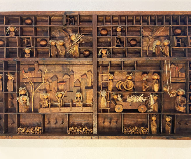 Sculpture sur bois - Format 85x50 - Dans cette œuvre sculpturale, j'ai voulu capturer l'essence rustique et authentique de la vie à la campagne. J'ai méticuleusement assemblé des éléments de bois, chacun choisi pour évoquer une sensation de nostalgie et d'appartenance. Les détails minutieux et les textures chaleureuses invitent au toucher, évoquant les traditions et les souvenirs oubliés. Cette sculpture est un hommage à la simplicité et à la beauté de la nature et des travaux manuels, une célébration de l'harmonie entre l'homme et son environnement. Elle apporte une énergie paisible et réconfortante à tout espace de vie, réminiscence d'une époque révolue.
