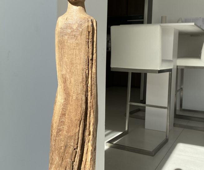 Sculpture sur bois (chêne) - Format 60x12x12 - Cette œuvre d'art captivante est une sculpture en bois, se distinguant par sa simplicité et son élégance. Le personnage, finement sculpté, évoque une sérénité intemporelle. Le bois, usé par le temps, ajoute une texture riche et authentique, conférant à la pièce une aura antique. La figure sculpturale est verticalement élancée, accentuant l'idée de hauteur et de grandeur spirituelle. Son visage est minimaliste, dégagé de détails superflus, créant un mystère et une introspection profonde. L'ombre projetée au sol amplifie son impact visuel, jouant délicatement avec la lumière pour créer une dimension supplémentaire. Idéale pour un espace contemporain ou minimaliste, cette oeuvre suscite réflexion et admiration, une véritable célébration de la beauté brute et du savoir-faire artisanal.