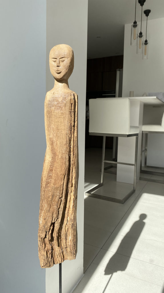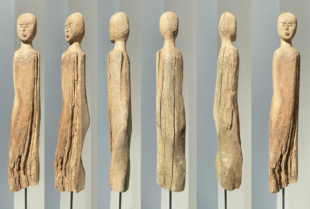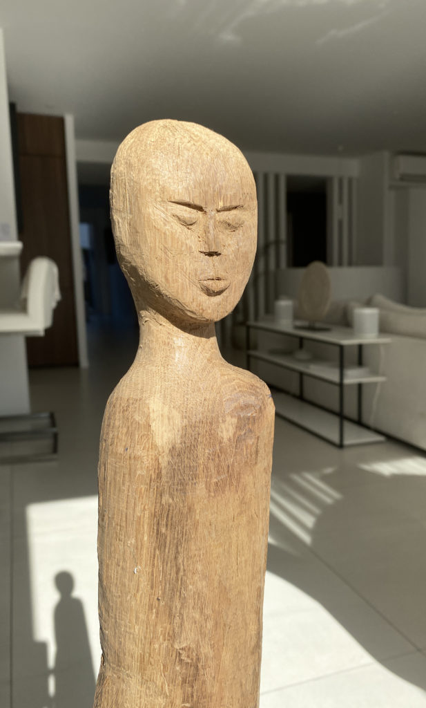 La figure, finement sculptée, évoque une sérénité intemporelle. Sa verticalité élancée accentue une sensation de hauteur, presque de grandeur spirituelle, tandis que son visage minimaliste, dégagé de détails superflus, ouvre un espace de mystère et d’introspection.